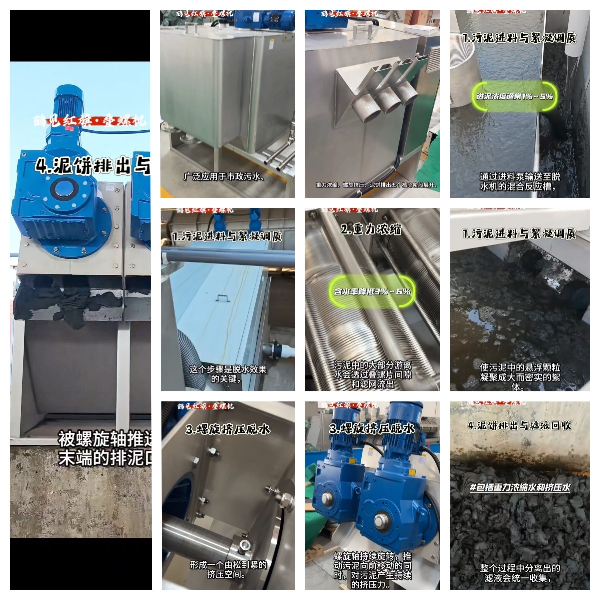 叠螺式污泥脱水机是一种低能耗、易维护的污泥固液分离设备,广泛应用于市政污水、工业废水处理的污泥脱水环节,其运行过程围绕污泥进料、絮凝混合、重力浓缩、螺旋挤压、泥饼排出五个核心阶段展开,具体流程如下: